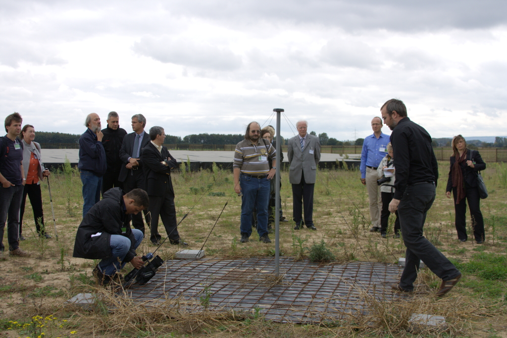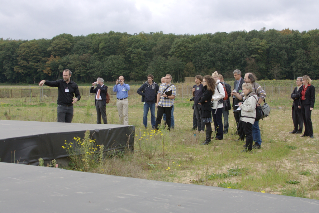 Während einer Besichtigungstour des LOFAR-Feldes erklärt Dr. Enno Middelberg den Gästen der Eröffnungsfeier die Funktionsweise der HBA Antennen ... (B. Biskup)